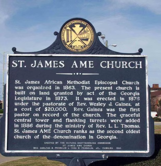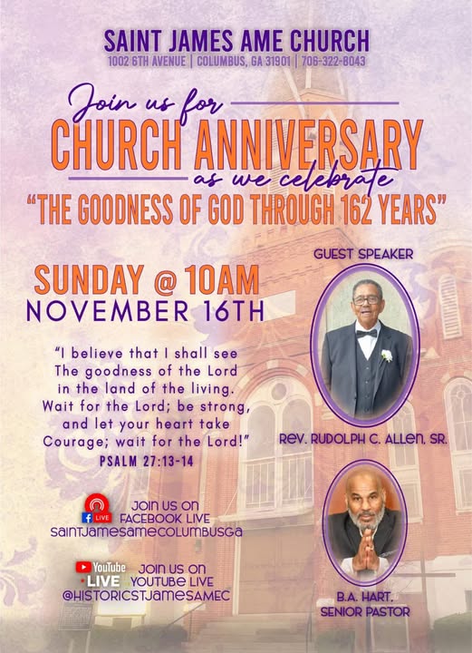 Saint James African Methodist Episcopal (AME) Church of Columbus, Georgia, was organized in November 1863. It is a beautiful historic structure located at 1002 6th Avenue, and the second oldest church of its denomination in Georgia. Tomorrow, Sunday, November 16, at 10:00 am they will honor that legacy during their worship services.