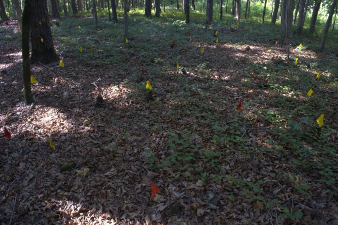 About a quarter-mile into deep woods, the once overgrown Wilson-Wheeler-King Cemetery is now covered in survey flags, red flags where its interred residents’ heads are, yellow at their feet. Some sit side by side, married couples buried together. A few flags sit inches apart, apparently children who died in their youth.