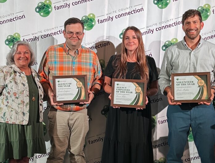 White County Family Connection Director Nanette Baughman celebrates community service with the agency's 2025 honorees. From left, Nyck Crumbley, Brandi Walker, and Dr. James Murphey were honored during the organization's awards ceremony on Tuesday, September 16, 2025. (Dean Dyer/WRWH.com)