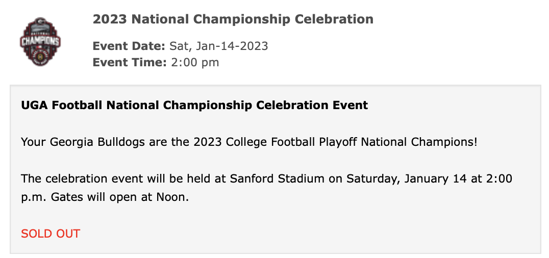 Bulldog fans wanting tickets to Saturday’s National Championship Celebration at Sanford Stadium in Athens are out of luck. The complimentary tickets are “sold out,” according to the georgiadogs.com website handling comp ticket requests.