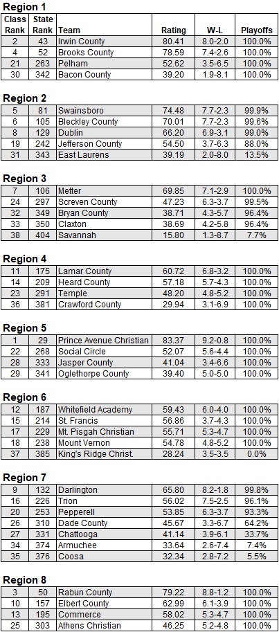 The Maxwell Ratings, compiled by mathematician and Georgia High School Football Historians Association founder Loren Maxwell, have projected the region finishes of all 413 football-playing schools in the GHSA. The projections are based on historical scores, with the most recent season weighing most heavily.