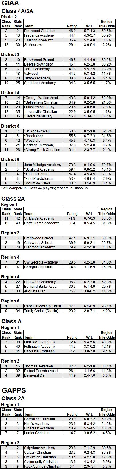 The Maxwell Ratings, compiled by mathematician and Georgia High School Football Historians Association founder Loren Maxwell, have projected the region finishes of all 413 football-playing schools in the GHSA. The projections are based on historical scores, with the most recent season weighing most heavily.