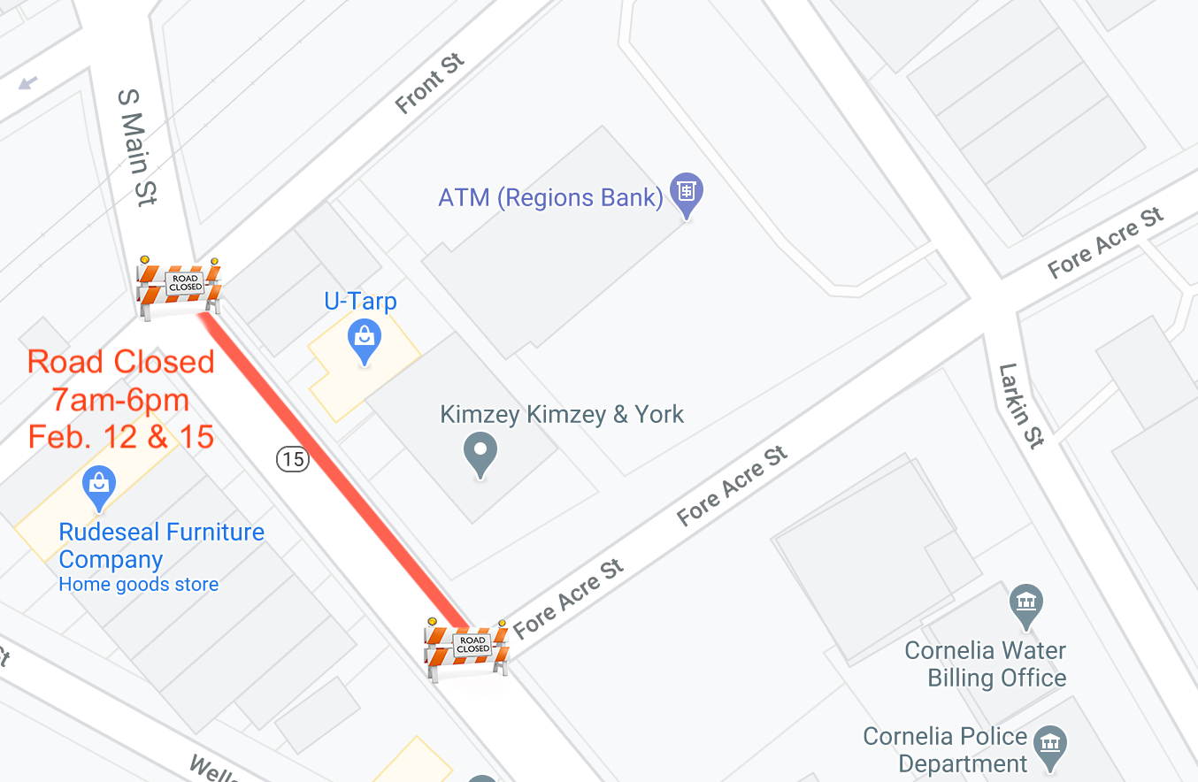 South Main Street in downtown Cornelia will be closed from Foreacre Street to Front Street from 7 a.m.- 6 p.m. on Friday, February 12 and Monday, February 15.