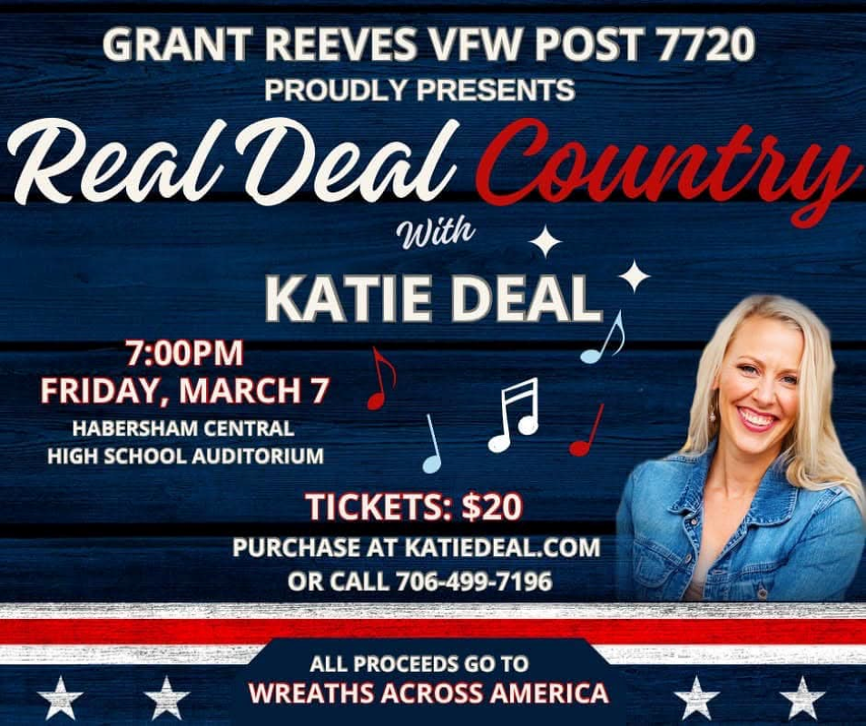 The Cornelia Grant Reeves VFW Post 7720 Commander Barry Church announced recently that the local post was presenting a concert to benefit Wreaths Across America. The concert will be performed by Real Deal Country featuring Katie Deal and will take place on March 7.