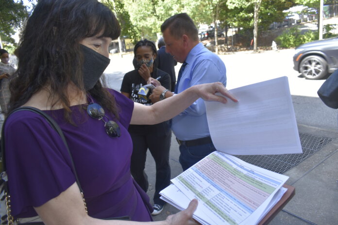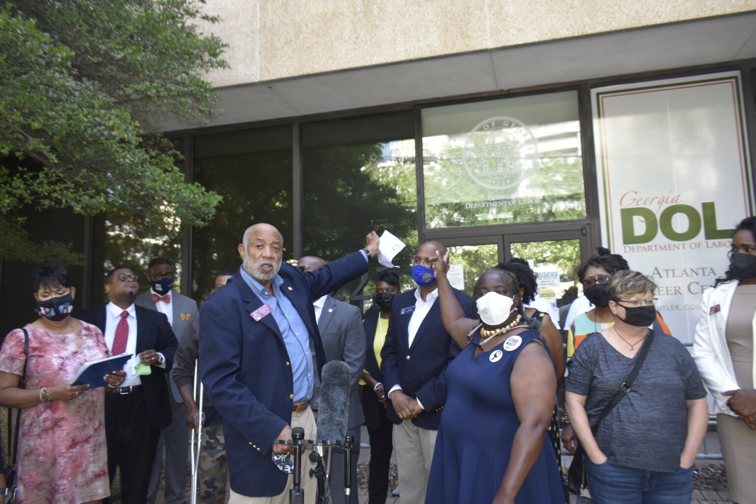 Shorts was one of a couple dozen unemployed workers, lawmakers and labor activists protesting in front of the Georgia Department of Labor headquarters in Atlanta Wednesday over a plan to end Georgia’s participation in federal unemployment programs, including one that provides an additional $300 in weekly benefits.
