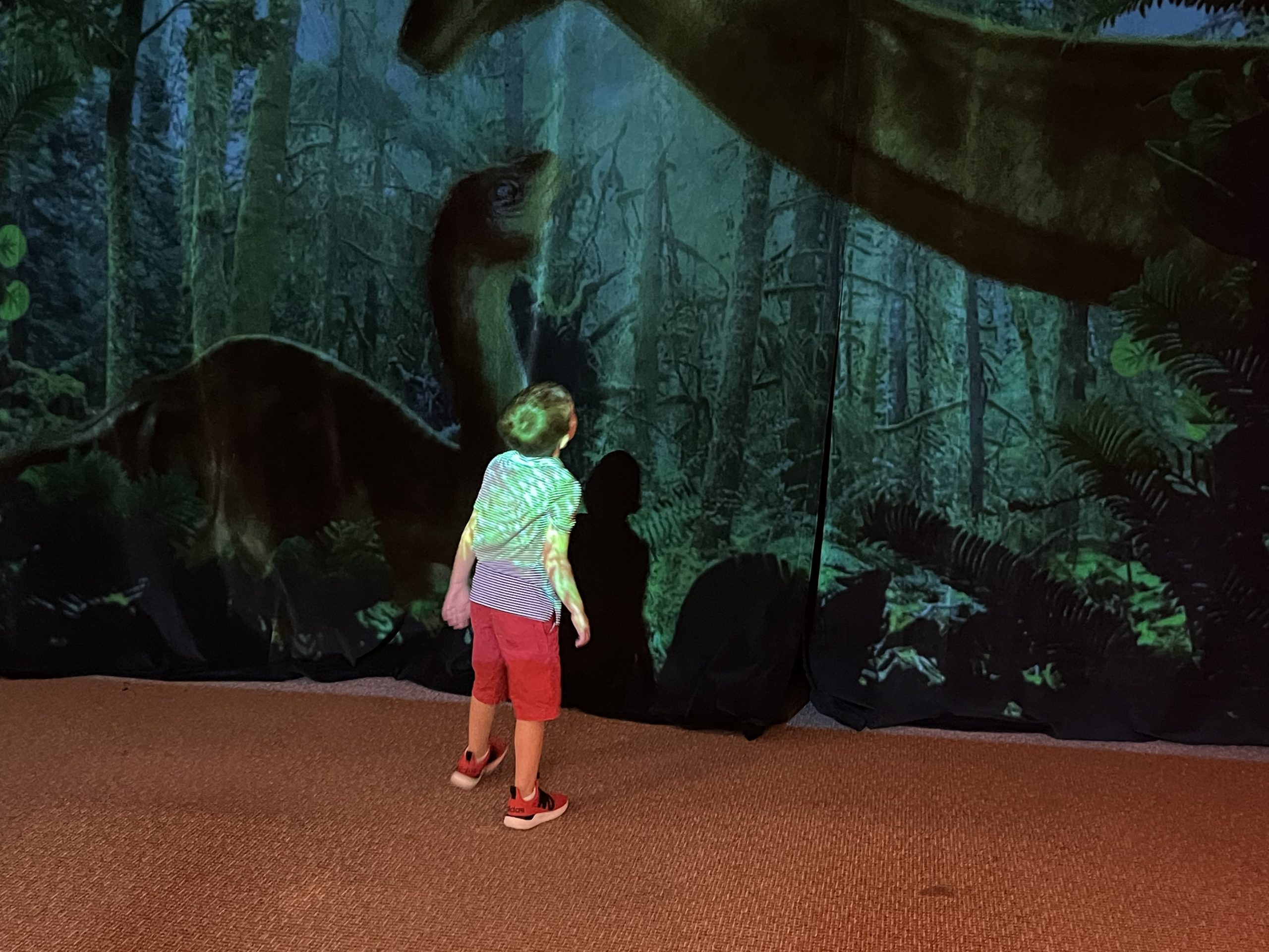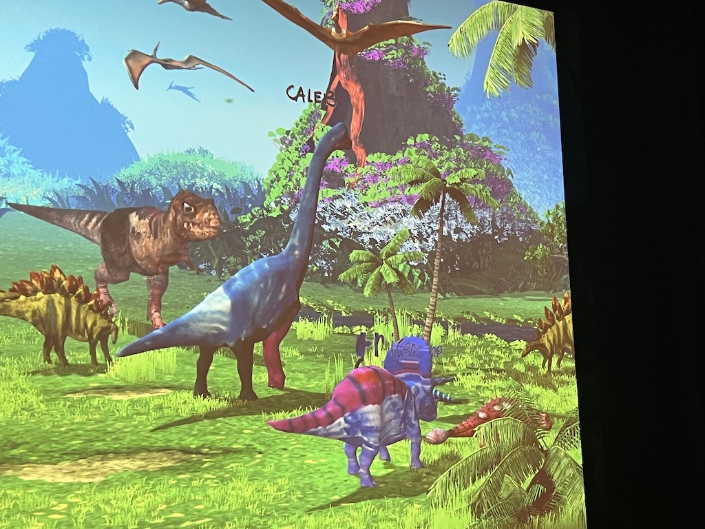Dinosaurs are arranged by continent of origin and by different historical periods. The size of the dinosaurs is sometimes overwhelming as the T-Rex, for example, towers overheard. What cannot be accurately portrayed are the colors of the animals. In the fun zoom for activities, children are given the opportunity to design the colors of a dinosaur for themselves which is then displayed in an on-screen exhibit. The children were captivated.