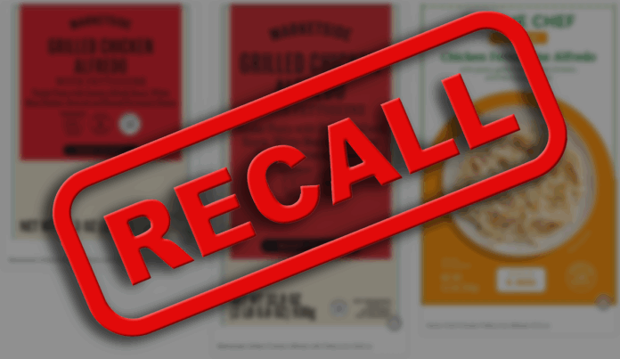— 32.8-ounce trays of Marketside Grilled Chicken Alfredo with Fettuccine Tender Pasta with Creamy Alfredo Sauce, White Meat Chicken, and Shaved Parmesan Cheese with best-by dates of June 27 or earlier.