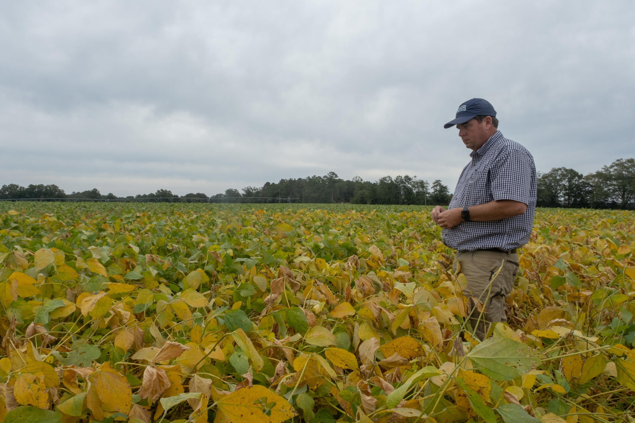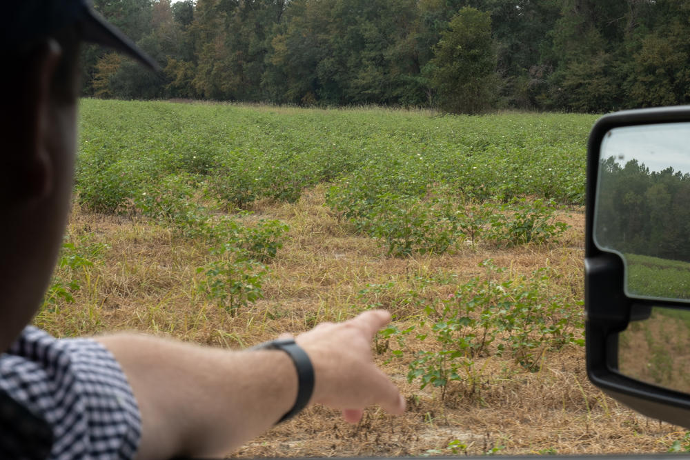 Lee runs a 10,000-acre row crop farm with his brothers and dad. They grow peanuts, soybeans, pecans and cotton. In one of the farm’s cotton fields planted later this season, Lee points out the damage.