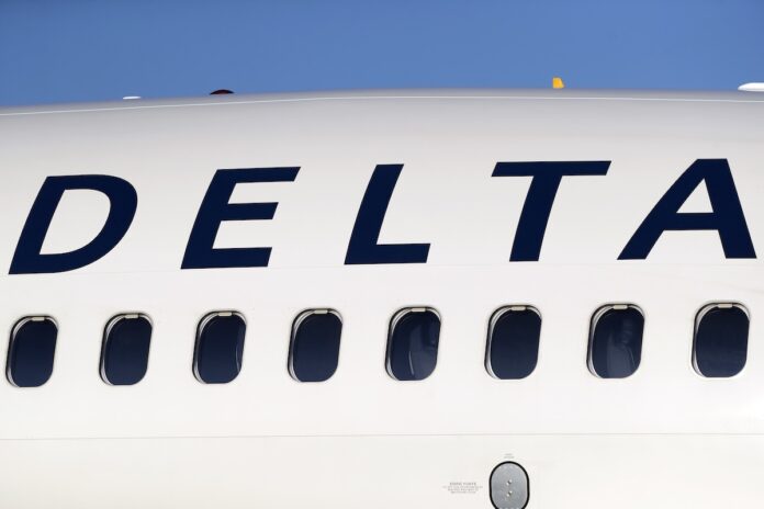 FILE - The company logo graces the side of a Delta Air Lines jetliner at Denver International Airport in Denver, on June 26, 2019. (AP Photo/David Zalubowski, File)