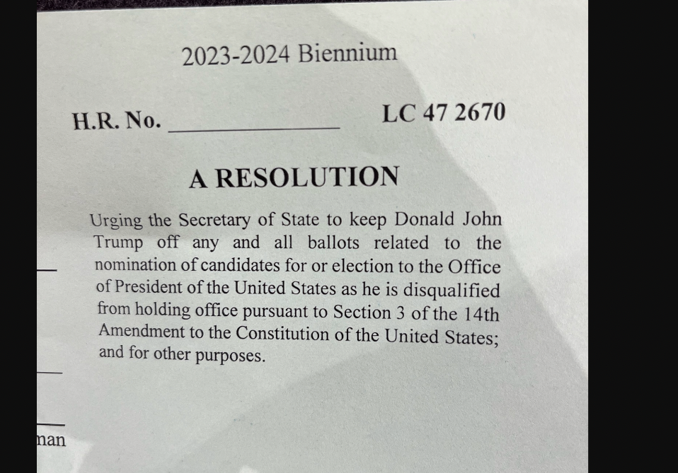 The resolution urges “the Secretary of State to keep Donald Trump off any and all ballots related to the nomination of candidates for or election to the Office of President of the United States as he is disqualified from holding office pursuant to Section 3 of the 14th Amendment…”