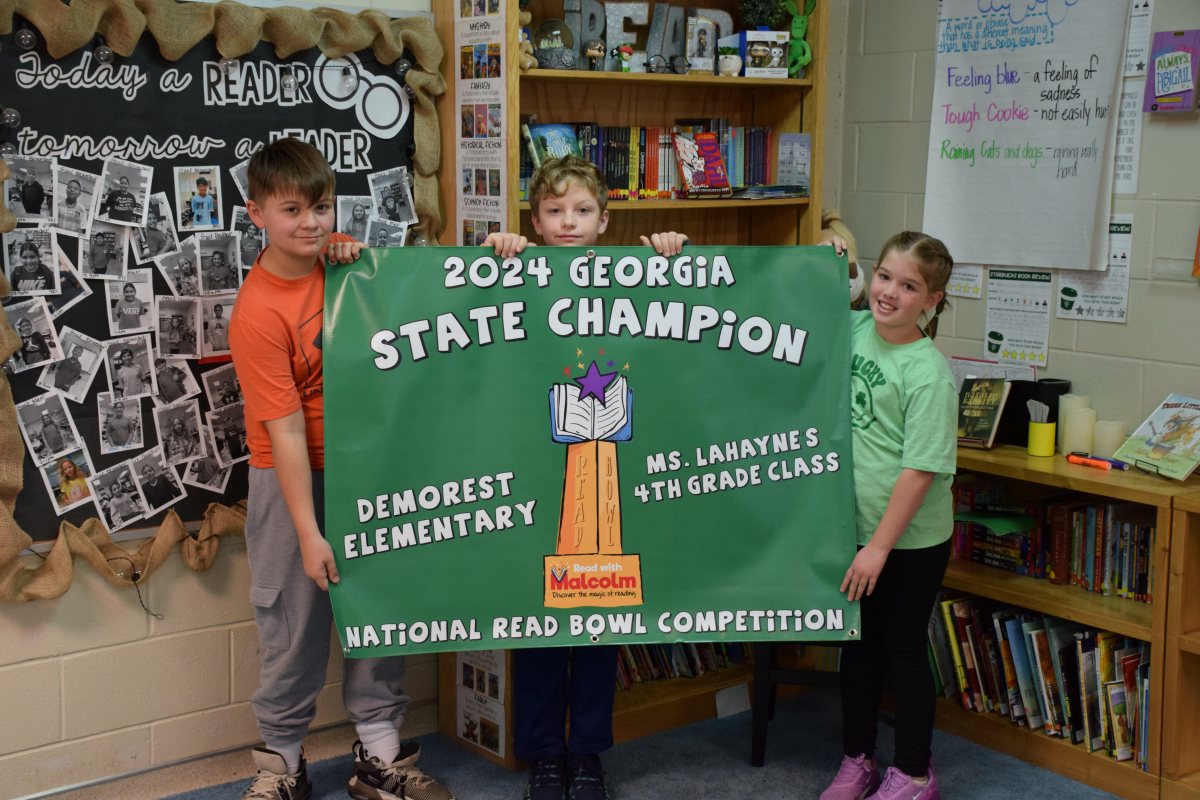 Demorest Elementary School's LaHayne's Reading Magic fourth grade class holds up their Georgia State Champion Banner. (Jerry Neace/NowHabersham.com)