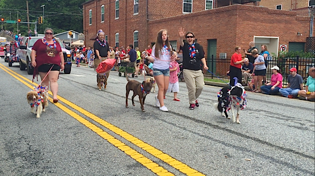 Habersham County Animal Care and Control Director Madi Hawkins (waving) and her rescue dog Norm paraded with patriotic pets from the shelter. For more information about adopting a pet call 706-754-3533.
