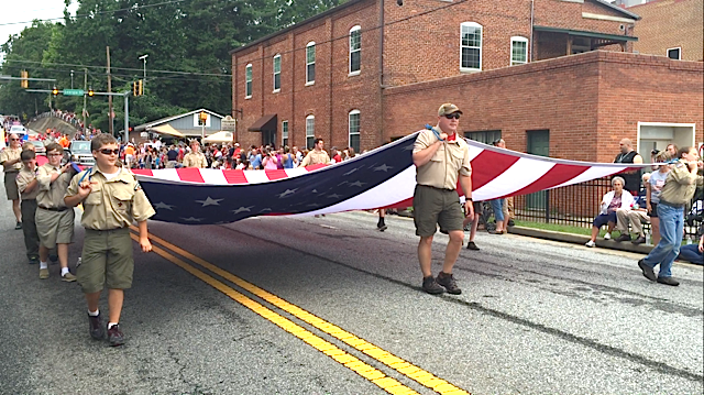 Boy Scouts from Troop 24 in Cornelia carry the Stars and Stripes. This oversized flag belongs to the City of Demorest.