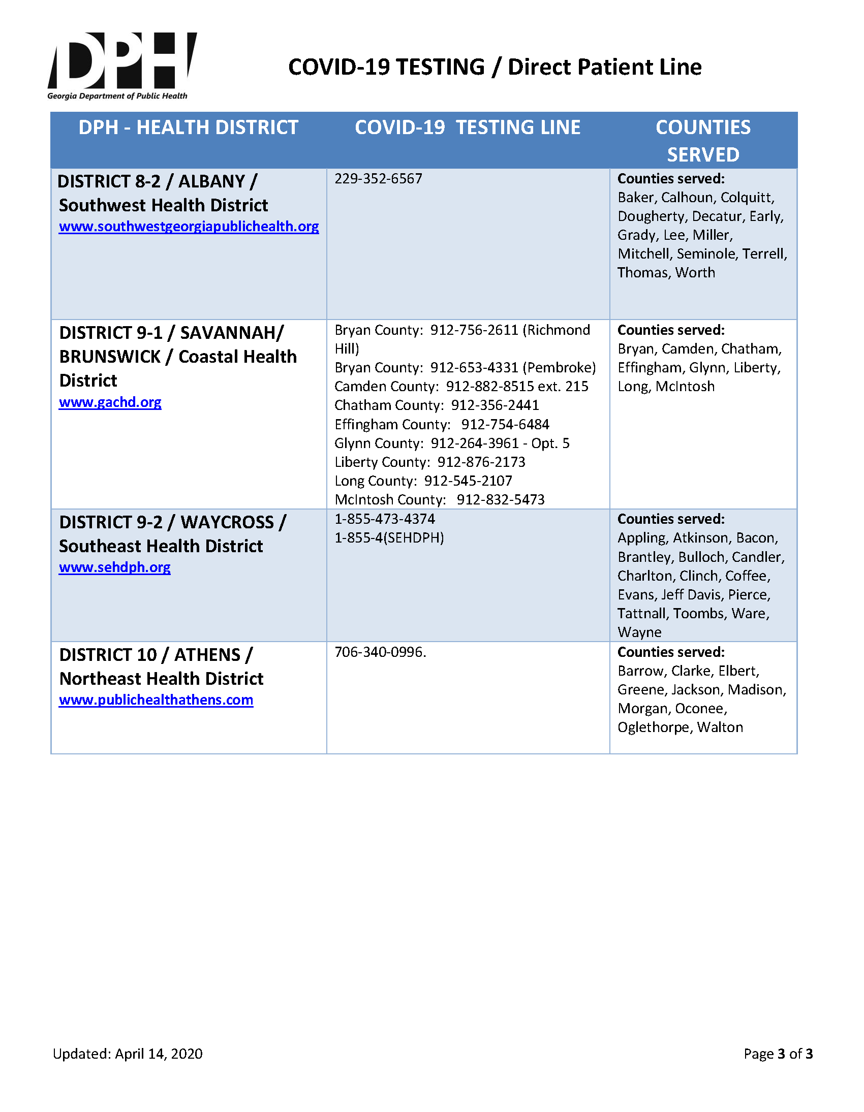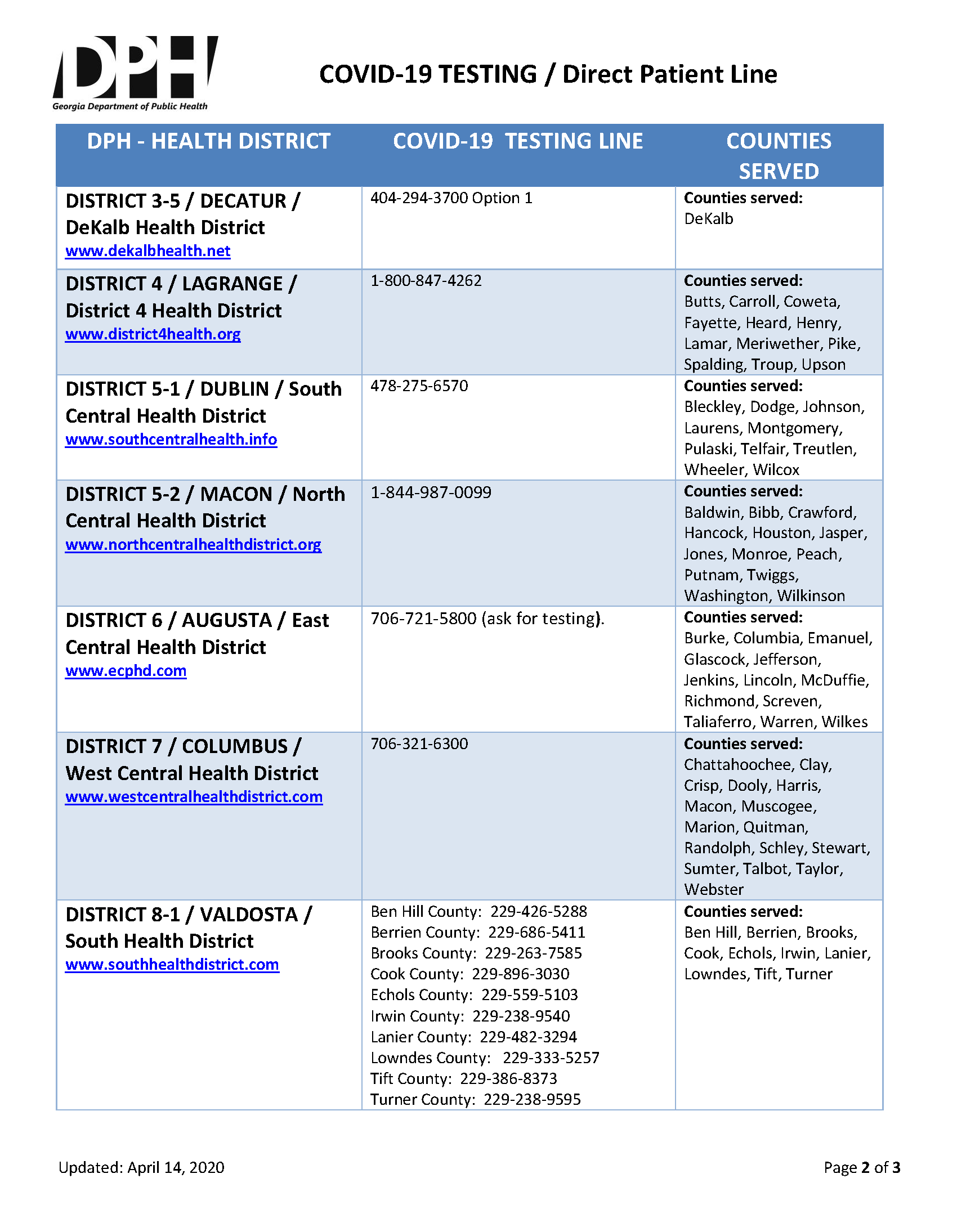 For more information about COVID-19 https://dph.georgia.gov/novelcoronavirus or https://www.cdc.gov/coronavirus/2019-ncov/index.html.