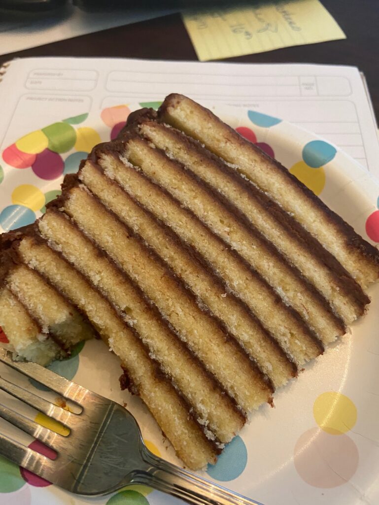 Words cannot describe just how amazing that cake was. I figured out that it was best to eat it in square bites of two layers of cake with two layers of icing (see the photo below). That square was the perfect balance that showed off the perfection of that cake. And it was perfection.
