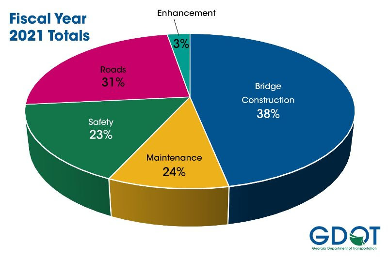 In Fiscal Year 2021, Georgia DOT awarded 416 projects valued at approximately $1.839 billion. This includes 385 Georgia DOT let projects valued at approximately $1.77 billion. The remaining 31 projects, worth approximately $69.4 million, were locally let. The projects included: