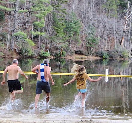 Video posted to the Unicoi State Park Facebook page captures the moment the ‘plungers’ ran shrieking and gasping into the 45 degree water. Family, friends and curious onlookers cheered them on from the relative warmth of the beach.