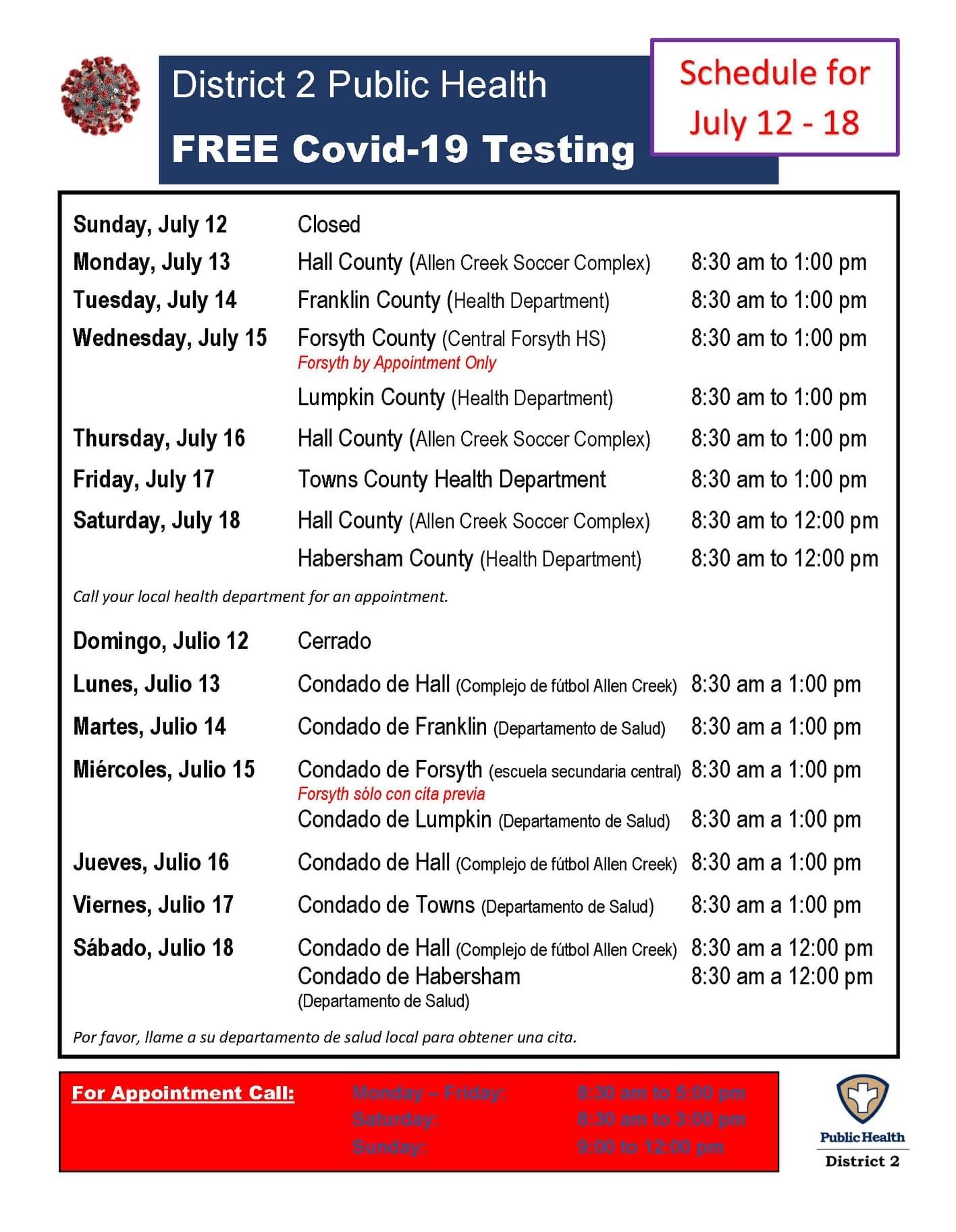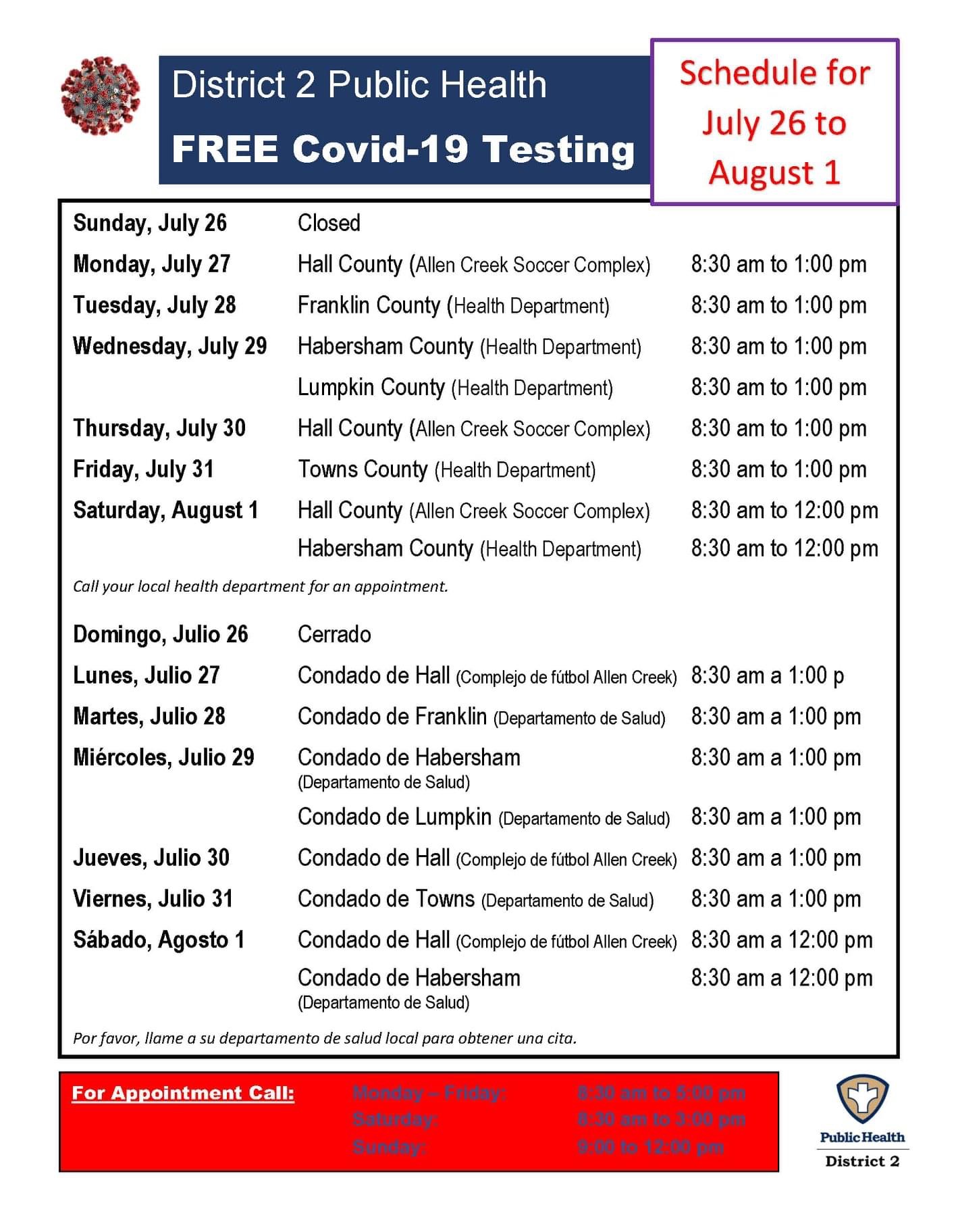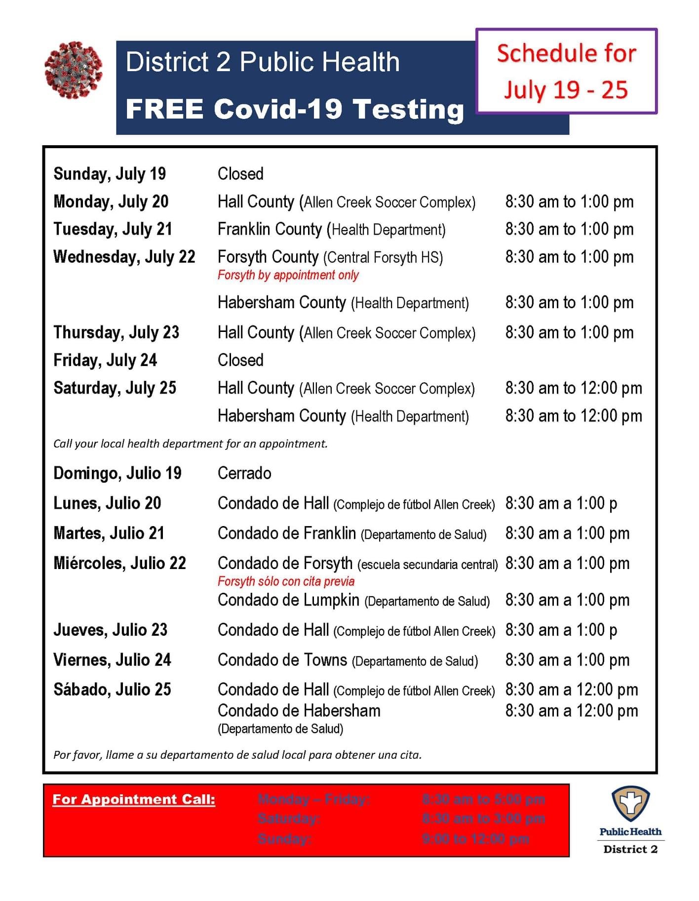 Testing is free and available to anyone with or without symptoms. The district includes Banks, Dawson, Forsyth, Franklin, Habersham, Hall, Hart, Lumpkin, Rabun, Stephens, Towns, Union, and White counties.