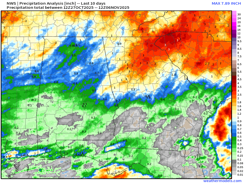 The bad news: the next 7-10 days look quite dry. Our only real chance for rain will come Friday night with a front pushing through. Much like the past few months, those who live north of I-20 will have the best chance for totals over 1/4″.