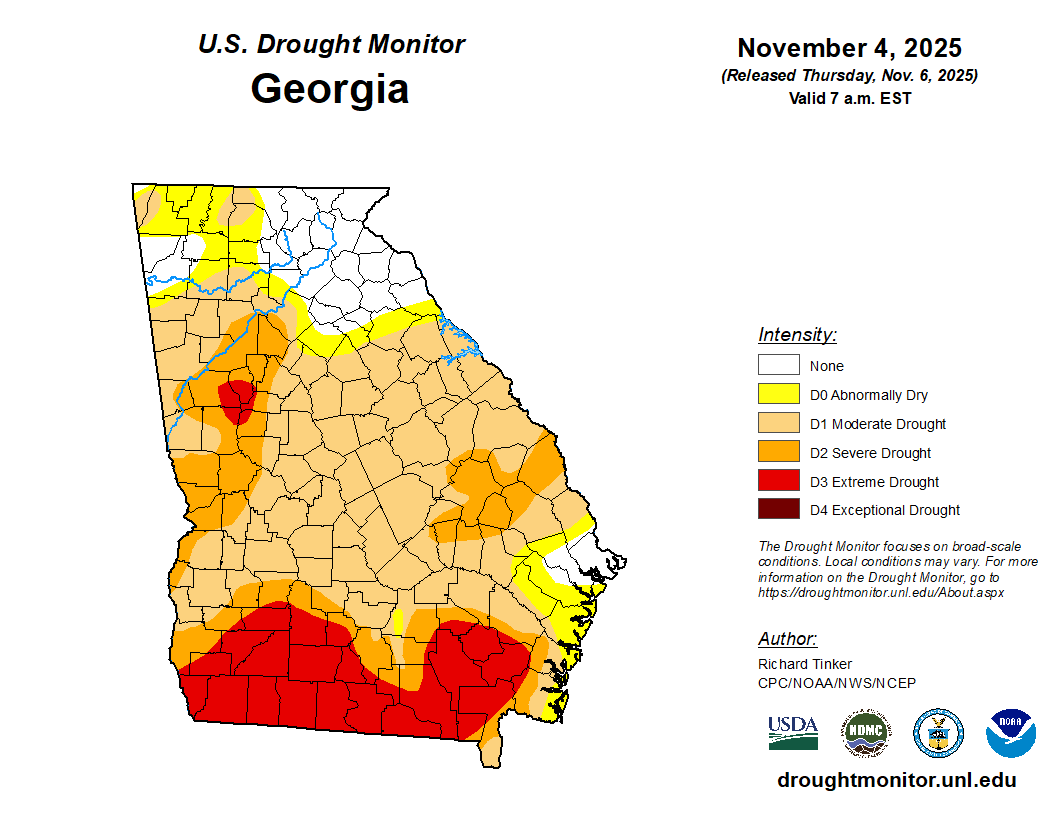 Further south the worst hit areas in west-central Georgia have picked up on average 1-2″. This has been enough to nearly eliminate the D3, or extreme drought. Only parts Coweta, Fayette, Meriwether, Pike and Spalding Counties remain in this category. For the state as a whole the D3 area decreased from 27% to 21%. Extreme South Georgia remains in a widespread, extreme drought that shows no signs of improvement anytime soon.