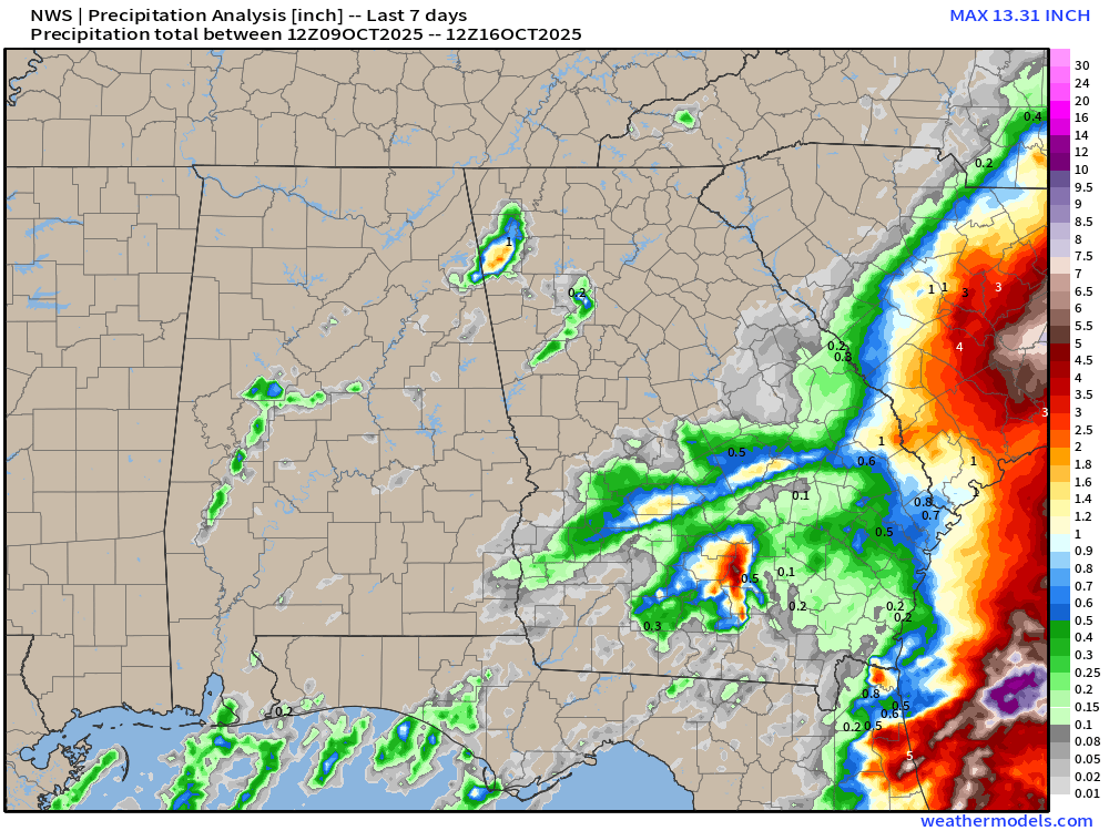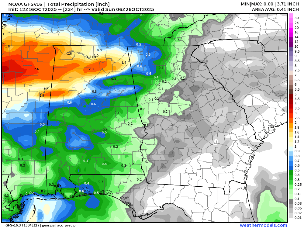 Unfortunately, it appears we will continue to remain mostly dry for the next 7-10 days. A cold front will bring some showers to the region on Sunday, but currently those are expected to be quite light. Weather models are still a bit split, with the Euro bringing higher totals than the GFS model, but in general the front does not look overly impressive. Further north higher totals are more likely across North Georgia and especially west into Alabama.