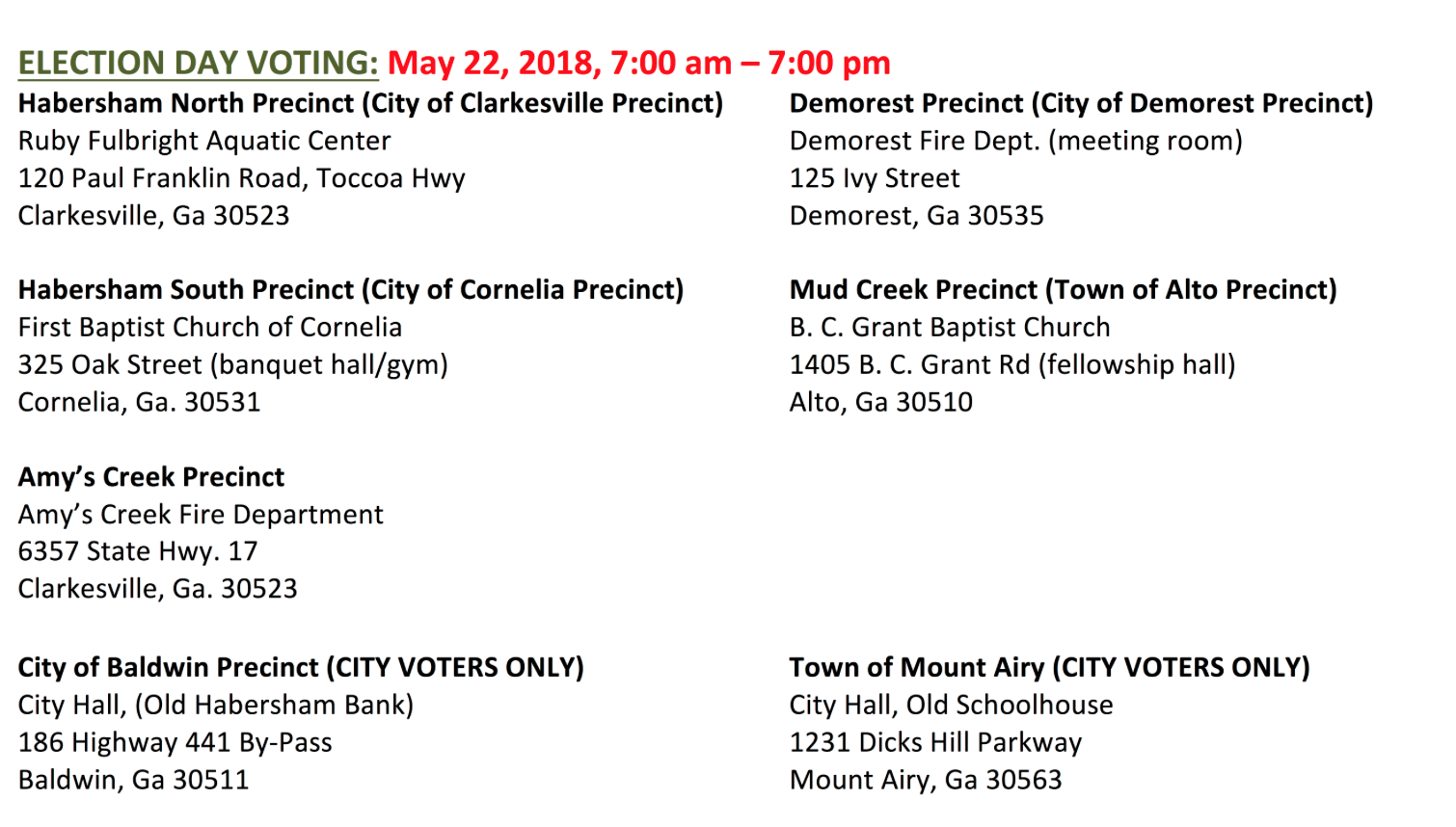 If you’re not one of them, your next chance to vote will be on election day, Tuesday, May 22. Precincts that will be open are listed below.