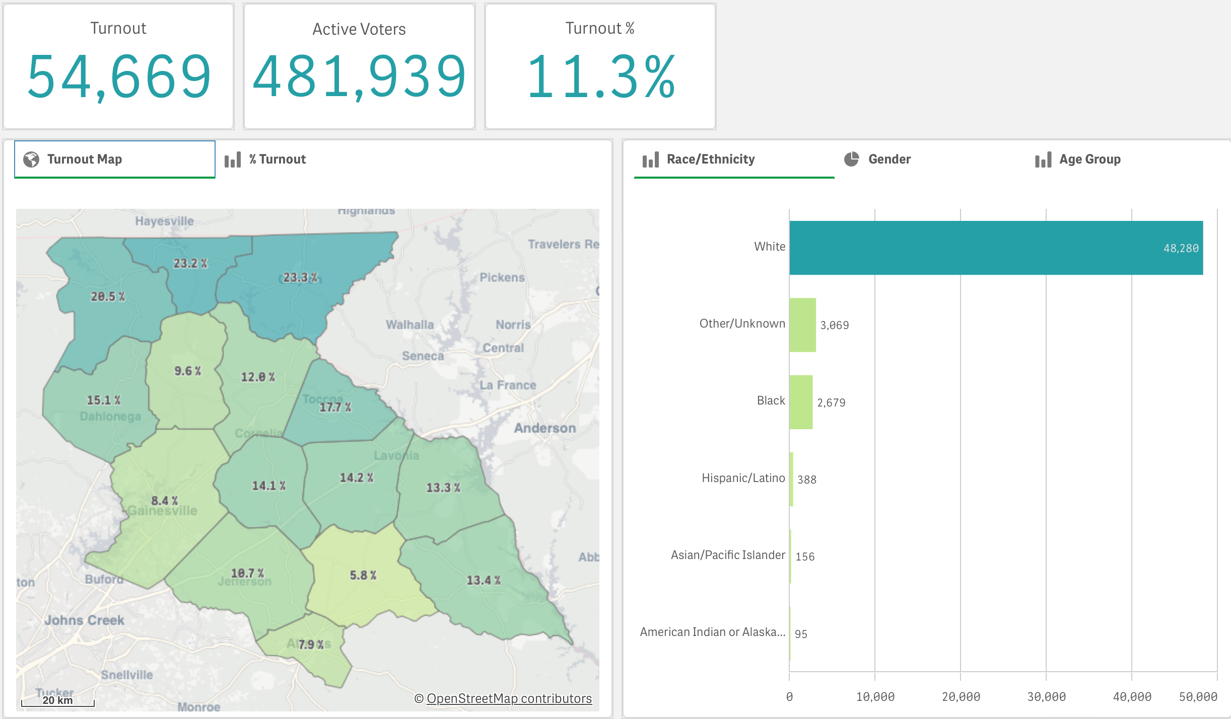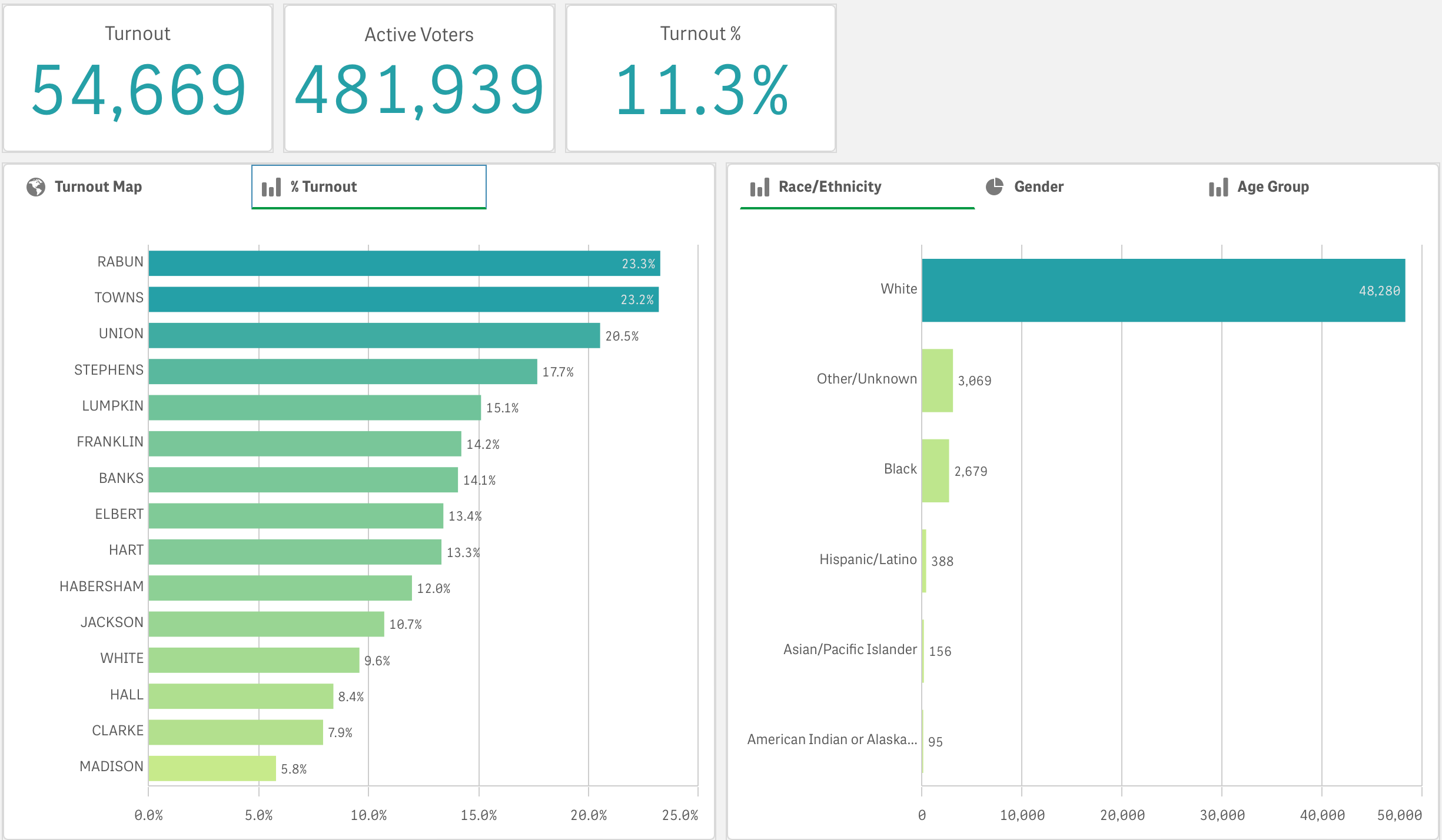 The regional voter turnout for Northeast Georgia is 11.3%, with just under 55,000 votes cast by the region’s 482,000 active registered voters.