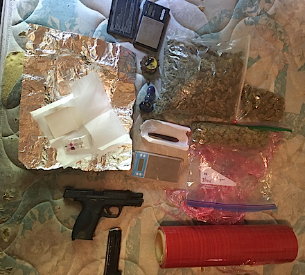 “The search warrant yielded one pound of marijuana, 2 blotter papers of approximately 100 hits of LSD, 5 grams of Butane Hash Oil and a .40 caliber semi-automatic handgun,” Posey says.