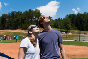 Tallulah Falls School senior Anna Davis of Clarkesville and recent TFS graduate Trey Wilcox of Tallulah Falls savor the view of the rare solar eclipse during a special program hosted on campus Aug. 21. (photo/E. Lane Gresham, Tallulah Falls School)