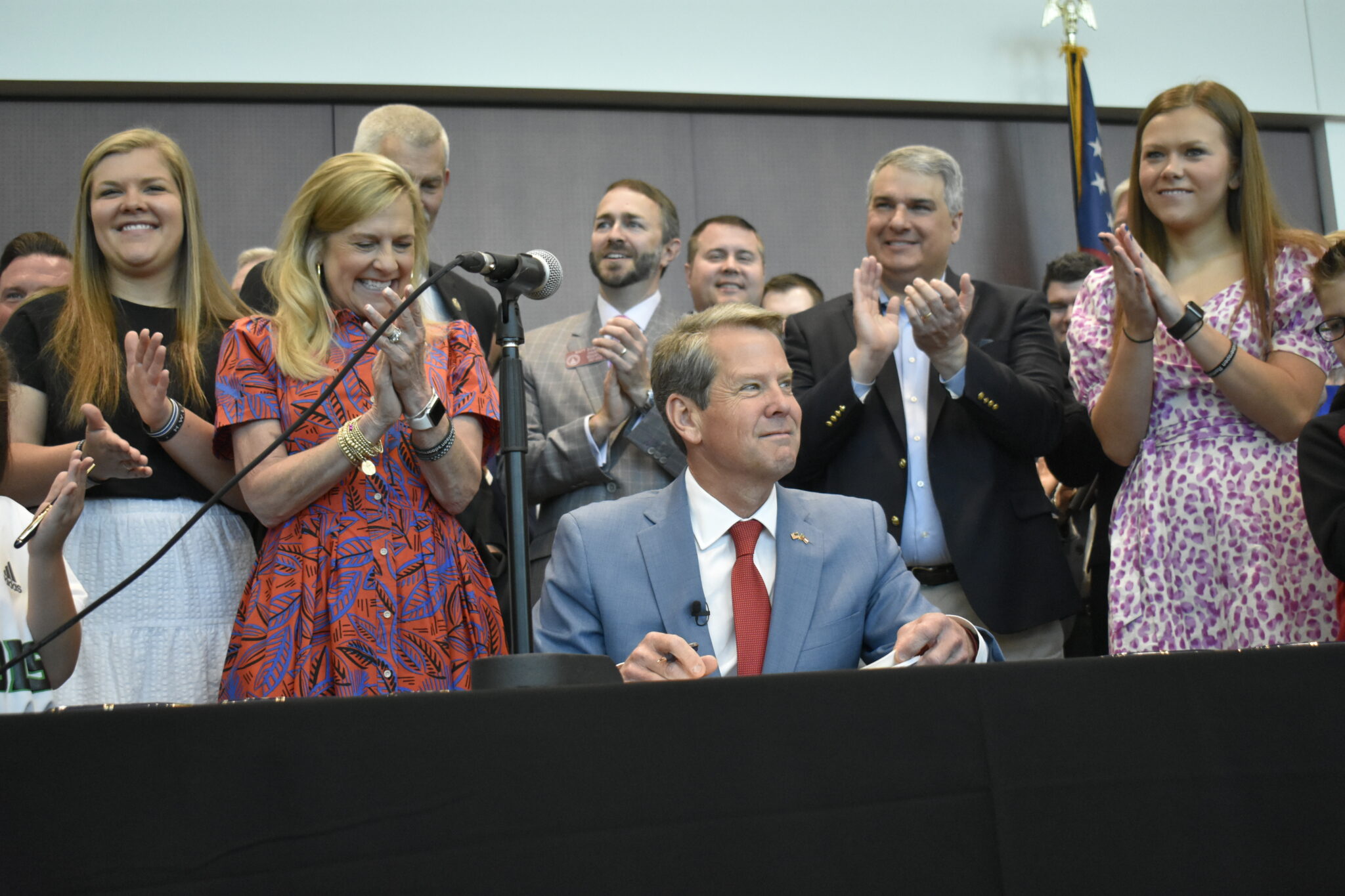 Gov. Brian Kemp’s 2023 priorities for Georgia’s K-12 students include more funding for school counselors and grants for parapros to become teachers. Pictured, Kemp signs education bills in April. 2022. (Ross Williams/Georgia Recorder)