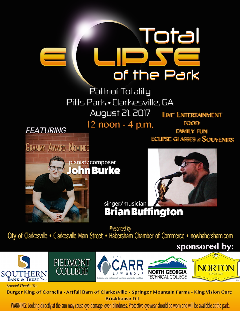 Get your shirts, round up your family and friends and come join us Monday, August 21st from 12 noon to 4 p.m. at Pitts Park in Clarkesville for our special solar eclipse viewing party presented by Now Habersham, City of Clarkesville, Clarkesville Main Street and the Habersham Chamber of Commerce.