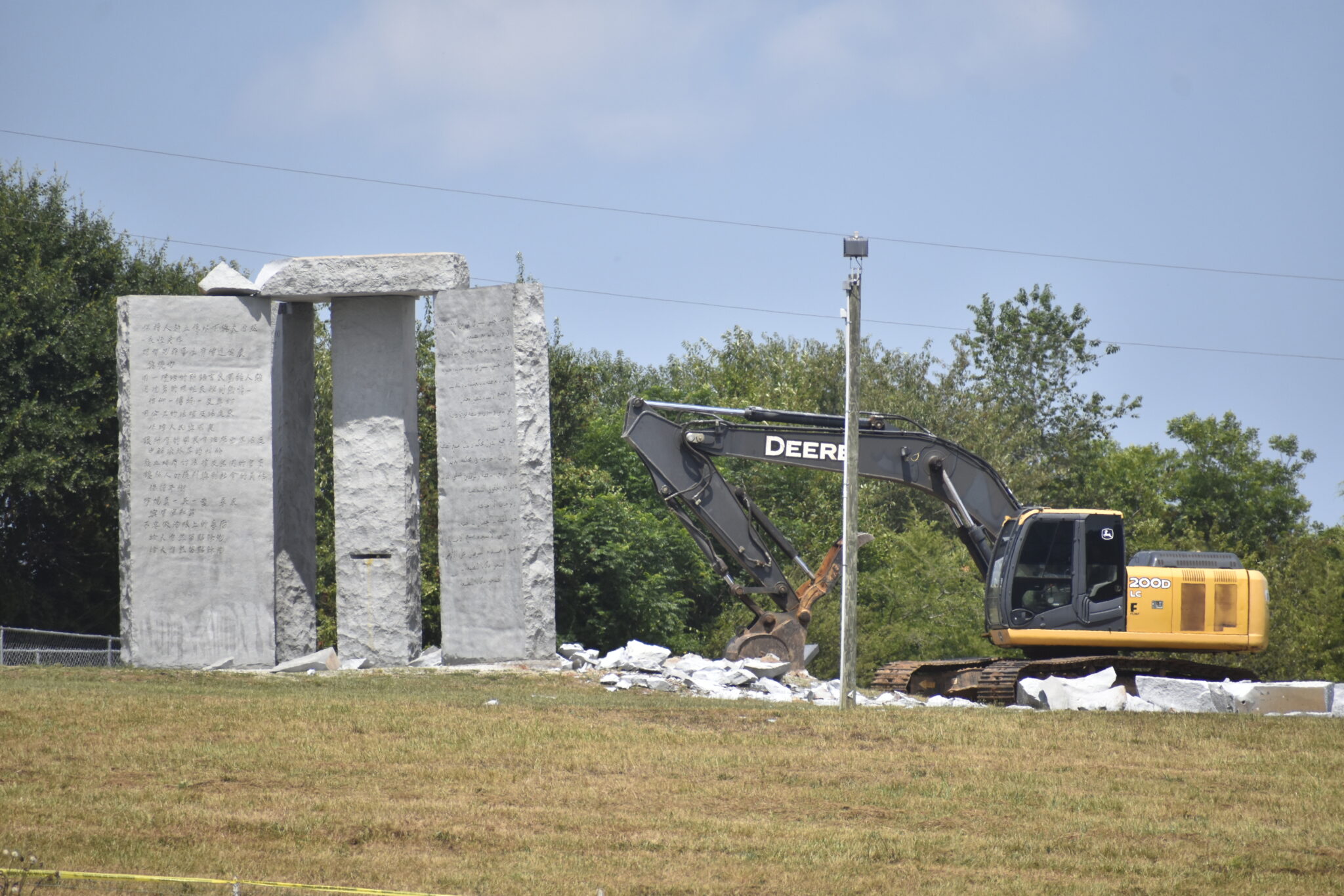 The GBI believes unknown suspects detonated an explosive device at about 4 a.m., reducing several of the upright stones to rubble. By 5 p.m., the remaining stones had been knocked down.
