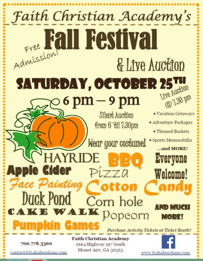 Faith Christian to host fall festival By Joy Purcell - October 9, 2014 FacebookTwitterEmailPrint Faith Christian Academy in Mt. Airy is hosting a Fall Festival on October 25. Proceeds benefit the school. It promises to be a great time for a great cause so mark your calendars now! Print Article