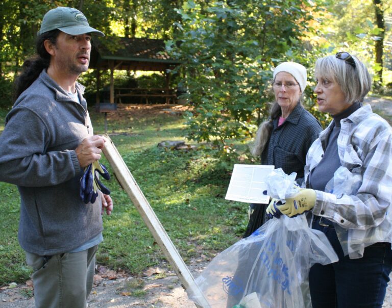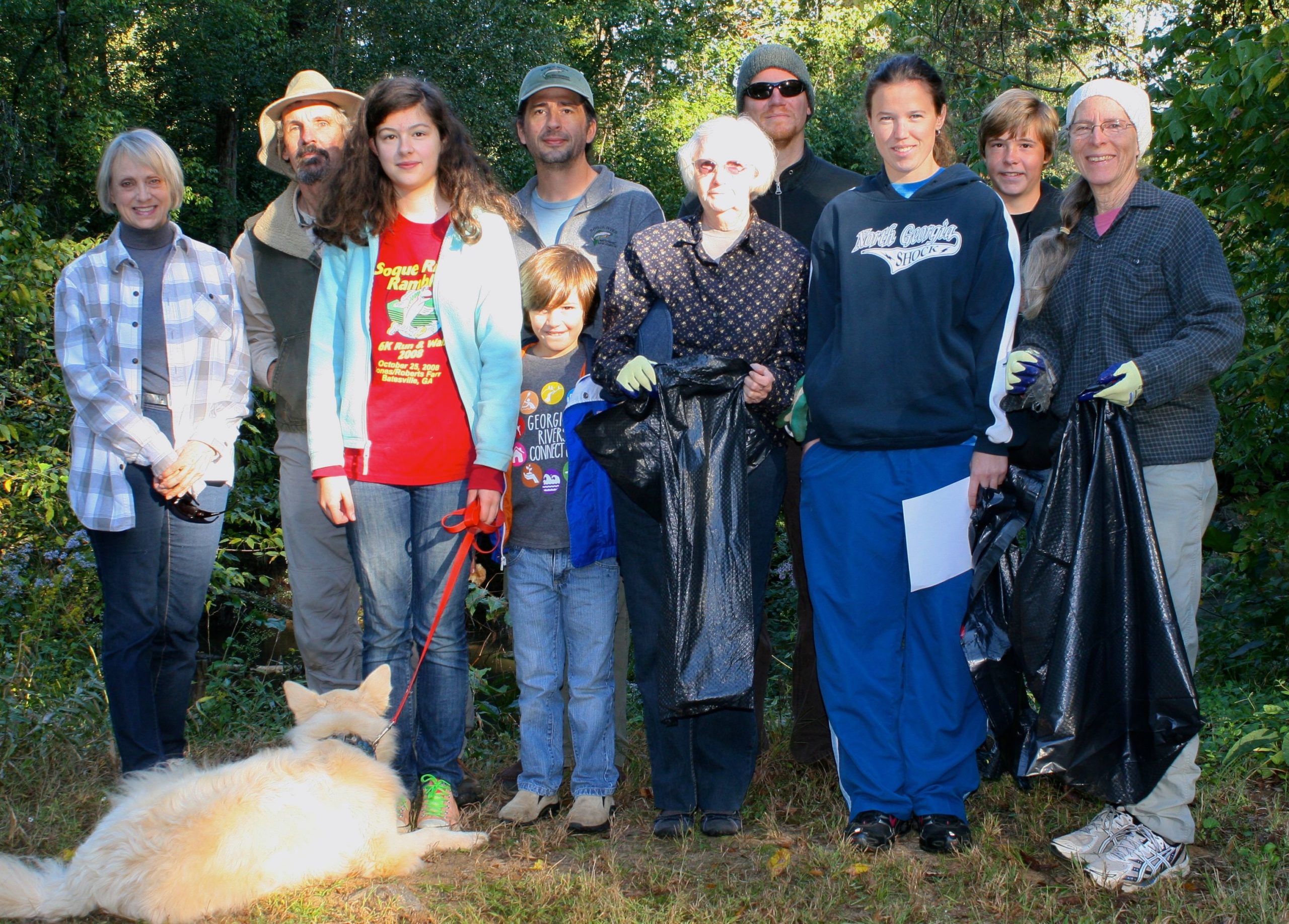 Duncan Hughes, left, talks with Genevieve Summers, center, and Andrea Harper about areas that need trash picked up around the Soque River at Pitts Park in Clarkesville. Ten local volunteers braved chilly weather Saturday morning to participate in the statewide Rivers Alive Clean-up sponsored by the state Environmental Protection Division outreach program. Hughes, the watershed coordinator for the Soque partnership coordinated the event locally. The group also cleaned a stretch of Rocky Branch along Mary Street Park. Among the debris removed from the waterways and surrounding area were a chair, car parts, plastic bottles, and aluminum cans. Volunteers Clarke Bailey, left, and Bob Brooksher pick up trash along Rocky Branch in an area behind the Lion’s Club soccer field in Clarkesville. Brooksher’s son’s dog, River, accompanied them.Beatrice York of Clarkesville picks up trash in Pitts Park.Rivers Alive clean-up volunteers in Clarkesville were, back row, from left, Andrea Harper, Bob Brooksher, Duncan Hughes, Justin Ellis, and Clarke Bailey. Front row, from left, are Elizabeth Hughes, Charles Hughes, Beatrice York, Shelby Whitlow, and Genevieve Summers.