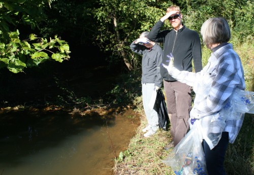 In the above photo, Rivers Alive clean-up volunteers survey beaver dams in Rocky Branch behind Mary Street Park. In addition to picking up nearly 200 pounds of trash, the volunteers removed two beaver dams causing erosion to the stream bank. From left are, Genevieve Summers, Justin Ellis, and Andrea Harper. (click on photos to enlarge images)
