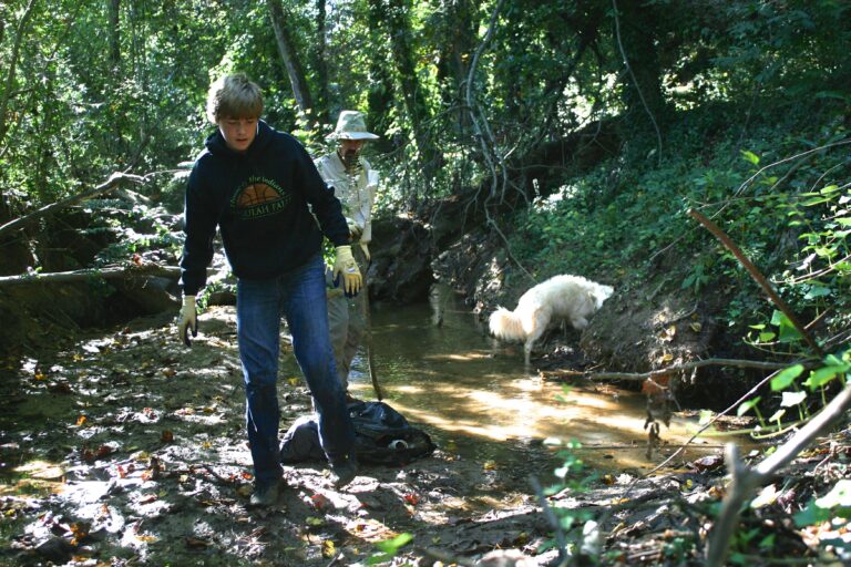Rivers Alive clean-up volunteers survey beaver dams in Rocky Branch behind Mary Street Park. In addition to picking up nearly 200 pounds of trash, the volunteers removed two beaver dams causing erosion to the stream bank. From left are, Genevieve Summers, Justin Ellis, and Andrea Harper.