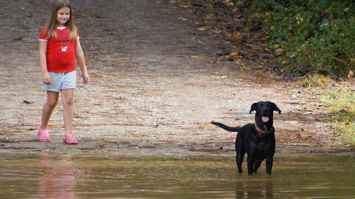 Amber Pirkle, who is new to the neighborhood, found out about the flooding Beaver Lake Drive experiences the hard way this morning. The mother of two had no safe way to get her children to school with the road flooded, and so the two girls are enjoying their “day off” playing with neighborhood dog Diamond.