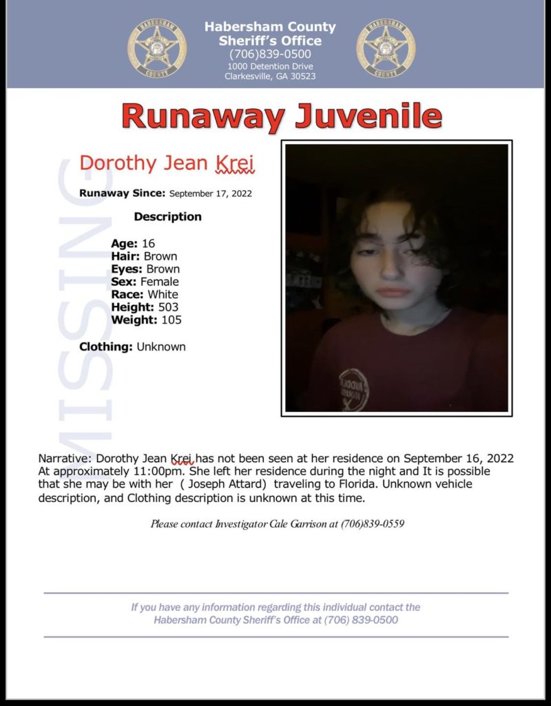 Family members say Joseph Attard, 16, of Cornelia, and his girlfriend Dorothy Krei, 16, of Clarkesville, ran away from home this past weekend. They were last seen in Habersham County around 1 a.m. on September 17 with two of Dorothy’s friends at Pitts Park in Clarkesville, says Attard’s mom, Penny Welborn.