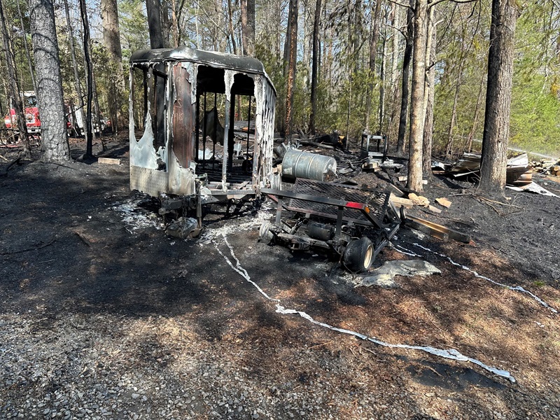 A storage shed, cargo trailer, and golf cart were destroyed by the fire.