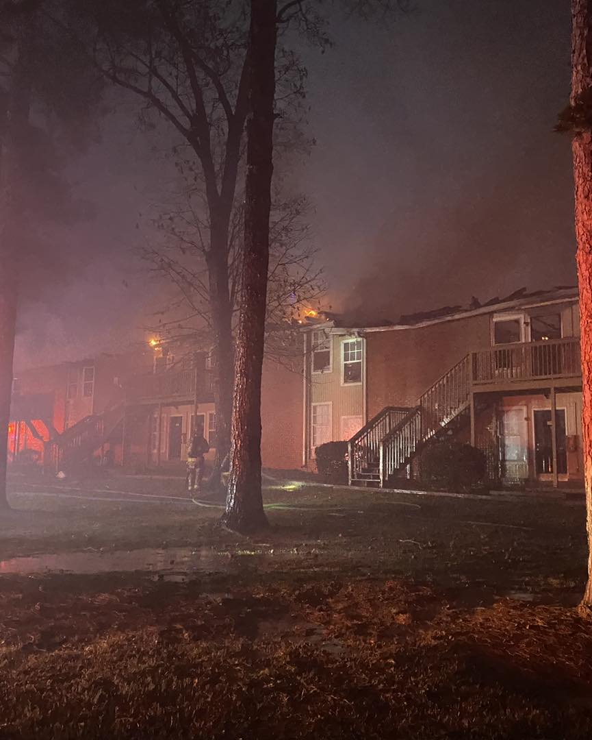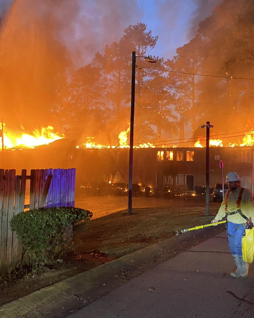 The fire broke out just before 5:30 p.m. on Friday, November 18, at the University Oaks Apartments at 2360 West Broad Street. Flames could be seen shooting into the air from the two-story structure. Athens-Clarke County firefighters used two aerial ladder trucks to fight the fire from above.