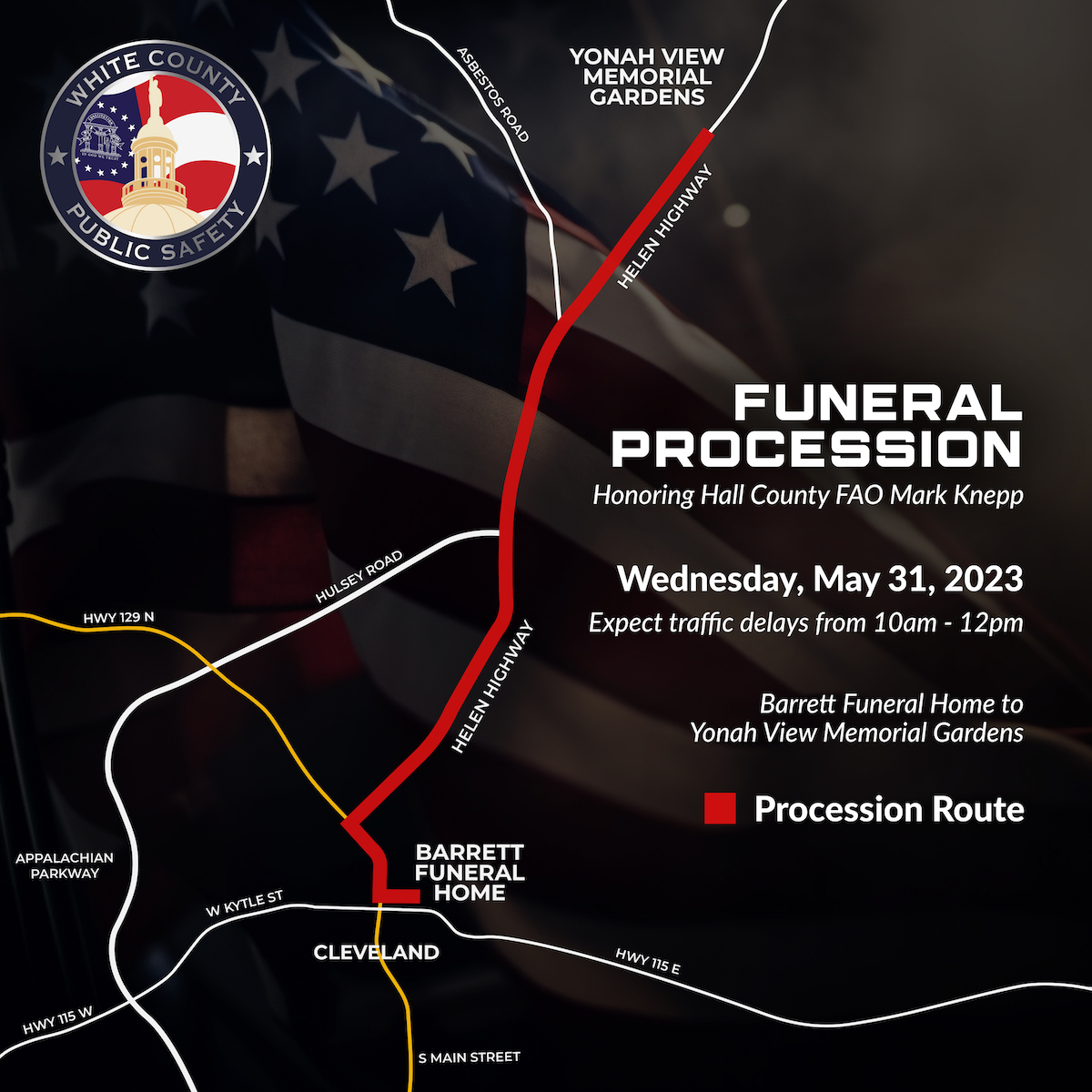 Fellow Northeast Georgia area firefighters and first responders will pay tribute to Knepp during a procession following the funeral. His body will be carried for burial from the funeral home on North Brooks Street in Cleveland to Yonah View Memorial Gardens on the Helen Highway/SR 75.