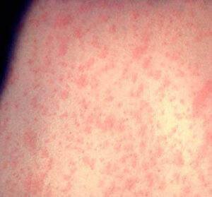 Measles is a viral illness characterized by fever, rash, cough, coryza, and conjunctivitis. It spreads when an infected person coughs or sneezes.