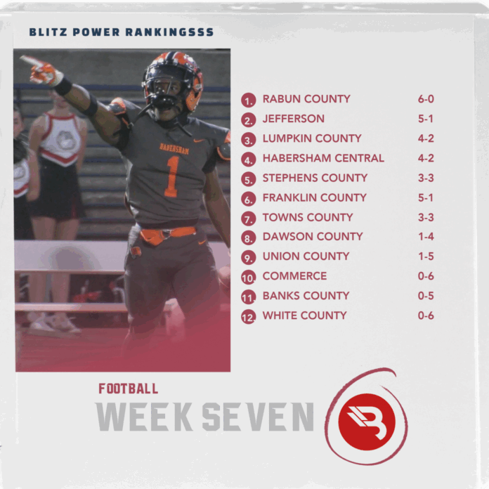 In this week’s BLITZ Power Rankings, Rabun County holds firm at the top with a spotless 6-0 record, while Jefferson remains close behind after notching its fifth win. Lumpkin County stays steady at No. 3, but Habersham Central and Stephens County both climbed a spot thanks to solid performances.
