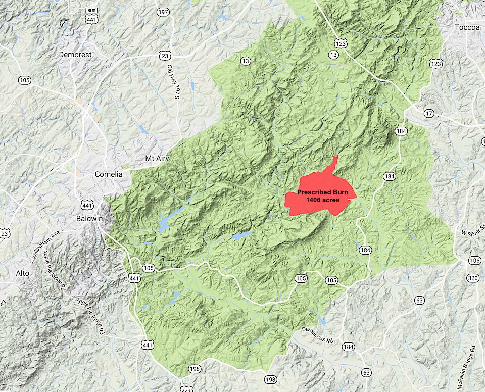 The prescribed fire covers 1406 acres on the Chattooga River Ranger District in the Farmer Mountain area at Lake Russell. It’s meant to improve wildlife habitat and reduce hazardous fuels.