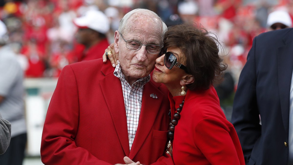 FILE - Former head Georgia football coach and athletic director Vince Dooley, left, gets a kiss from his wife Barbara during a ceremony to name the field at Sanford Stadium in his honor before an NCAA college football game against Murray State, Saturday, Sept. 7, 2019, in Athens, Ga.(AP Photo/John Bazemore)