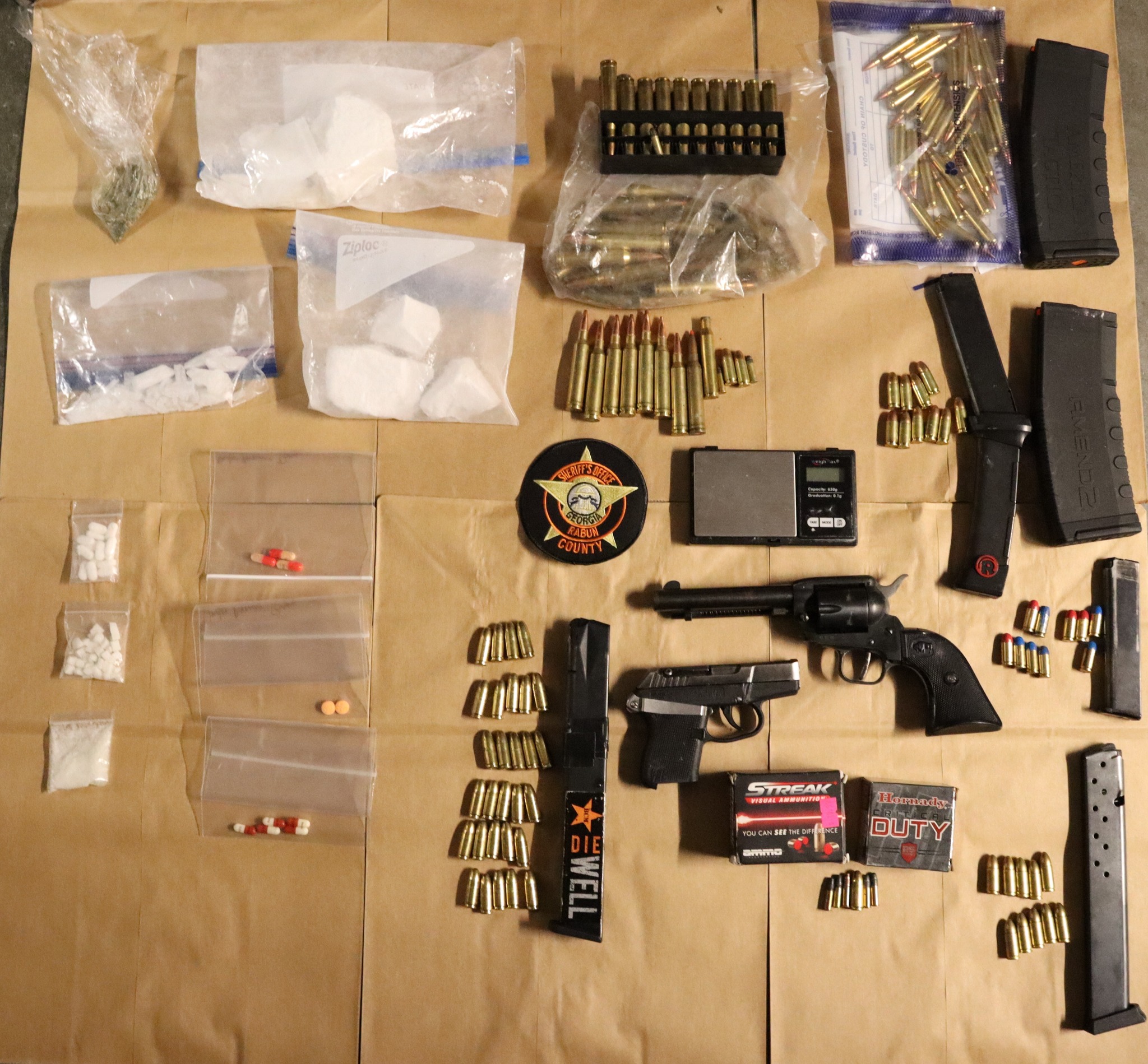 “During a search for the occupants, deputies located additional narcotics, drug paraphernalia, two firearms, and magazines that were thrown behind a structure,” the sheriff’s office states.
