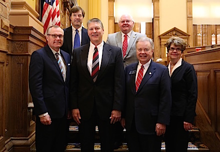 Pastor Mike Franklin (front row, 2nd from left) is pictured on the Senate floor with Lt. Governor Casey Cagle, Senator John Wilkinson, along with Dr. Judy Taylor, Dr. Larry Peevy, and David Foster representing the Habersham County Chamber of Commerce.