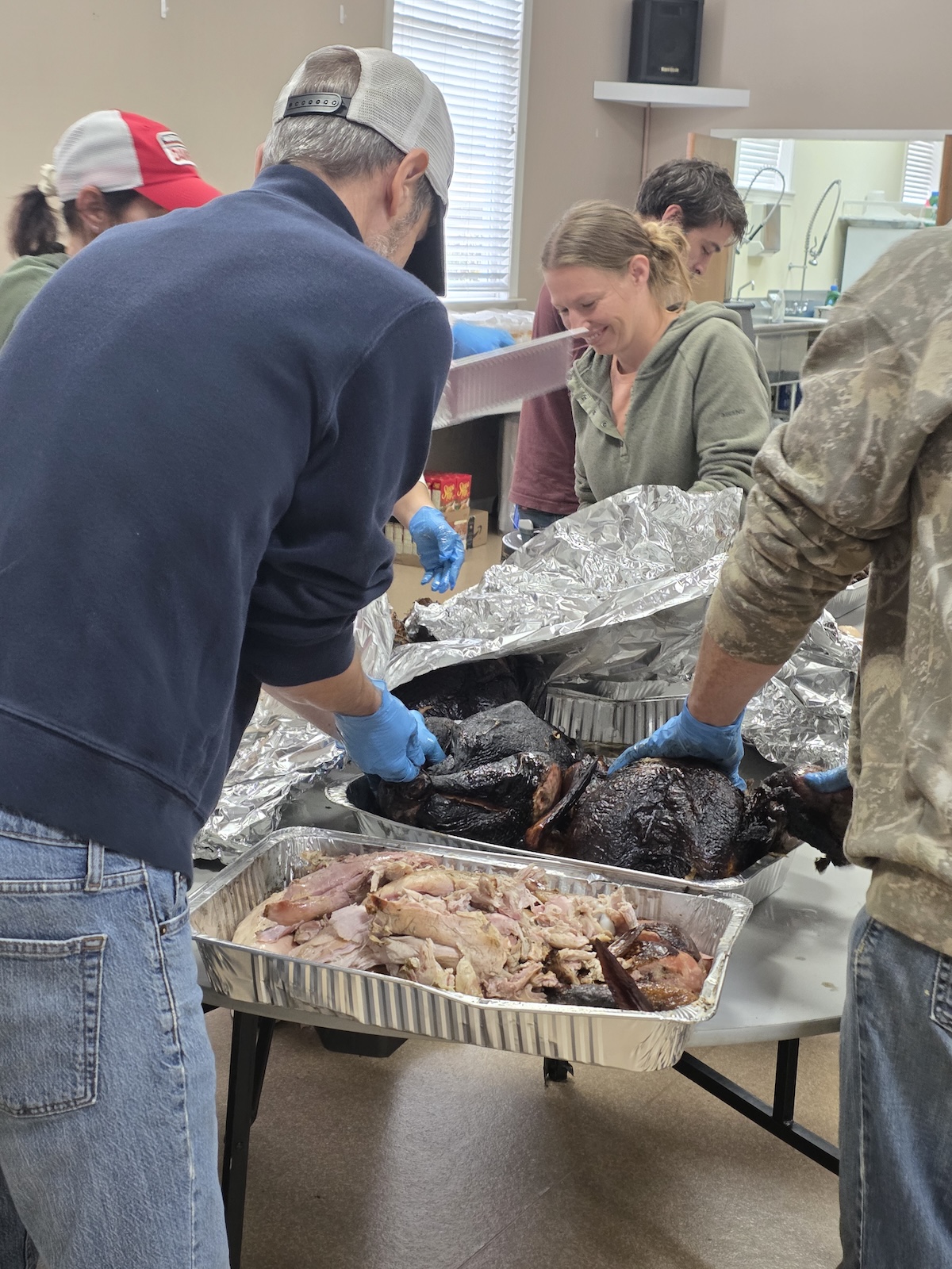 Donations came early this year — turkeys, broth, flour, sugar, oil, and gallons of sweet tea — many collected by Sherry Smith at the Clarkesville Dairy Queen. Today, volunteers poured in by 7 a.m. to start carving the 35 turkeys Holbrooks had smoked and to prepare the rest of the Thanksgiving feast.
