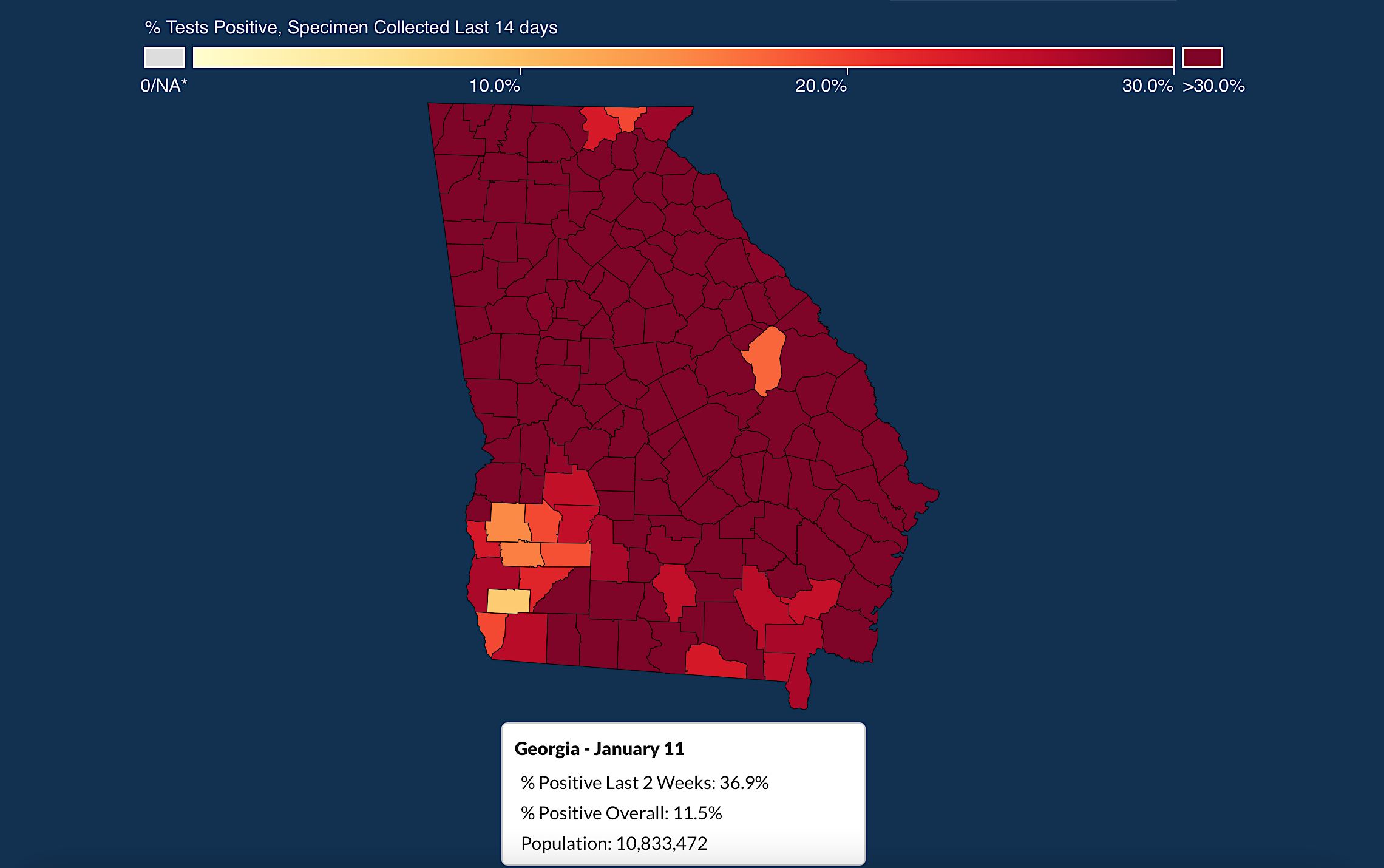 Habersham County’s 2-week positivity rate is now 36.1% – that’s the highest it’s been since the pandemic began in March of 2020. White County’s is even higher at 39.4% and Banks County’s is 44.2%.
