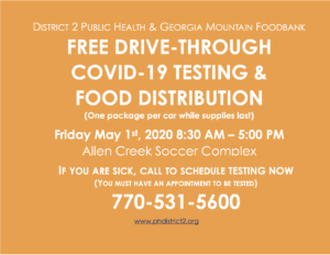 District 2 Public Health and the Georgia Mountain Food Bank are teaming up for a free COVID-19 testing and food distribution event this Friday, May 1.